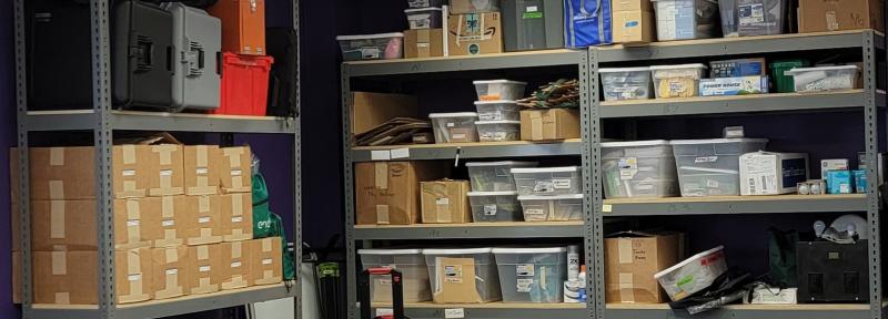 Boxes and storage containers and miscellaneous items stacked on shelves